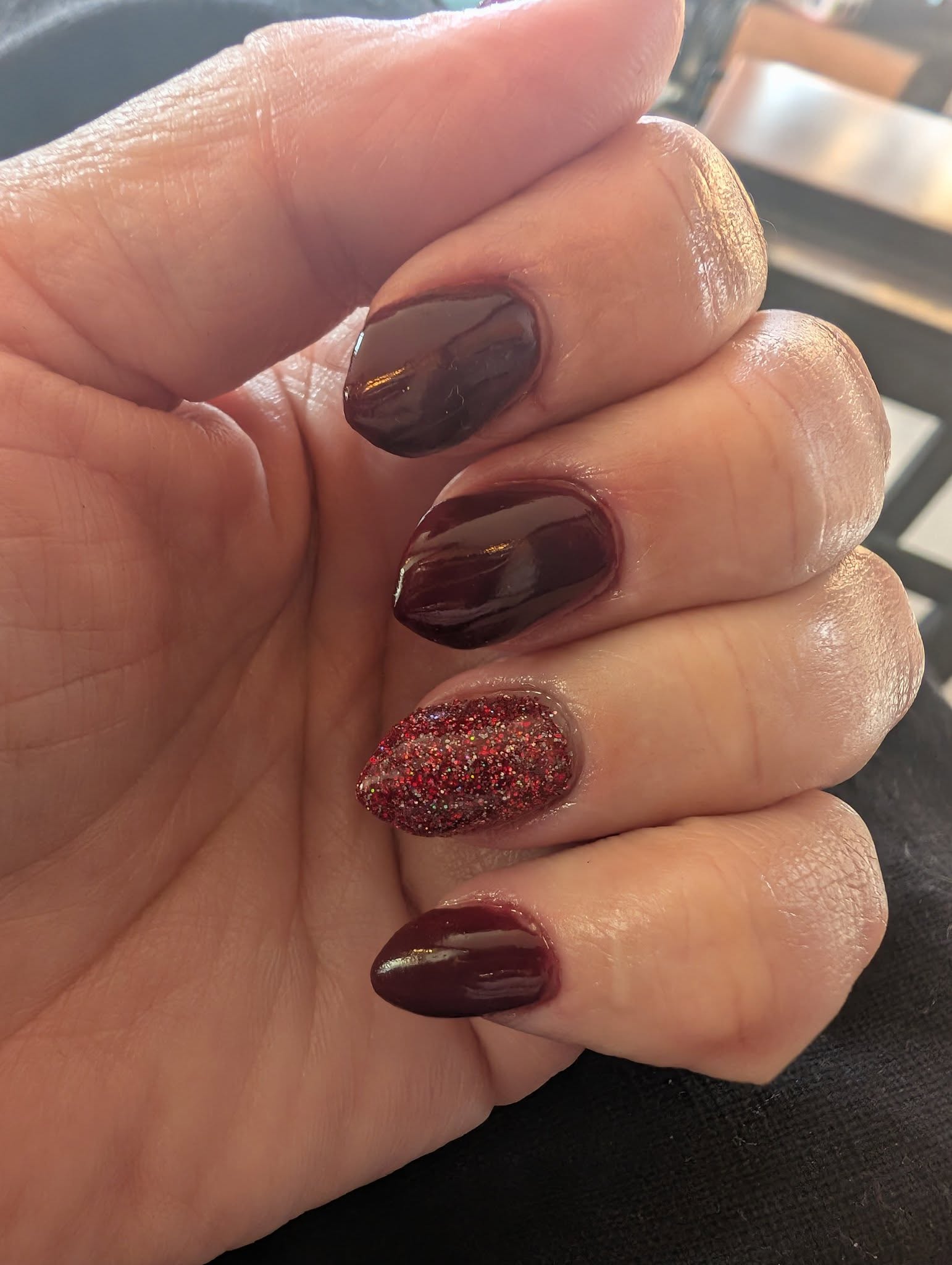 #MatchMani Matchar känslan för nya jobbet med PositiviTea och ett djupt rött🍷. Mattlack och shine i kombination. Matt med shiny tipps på tre av fem. 😍 #dippi