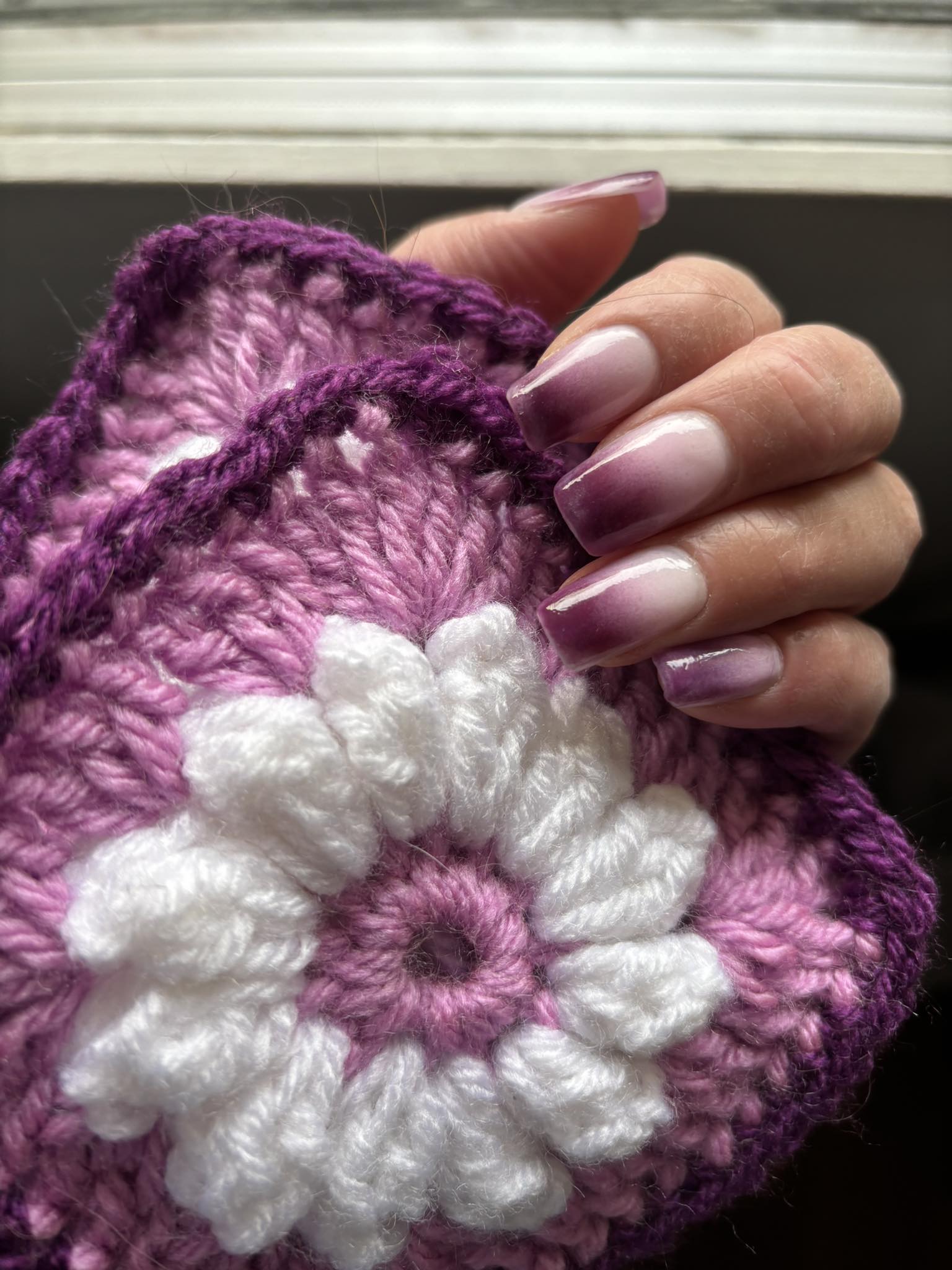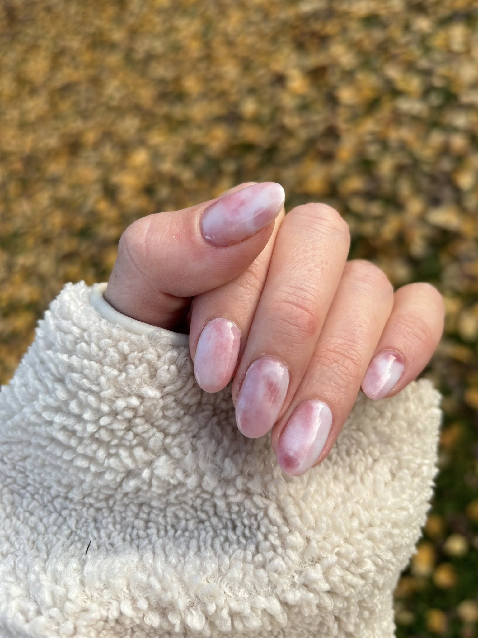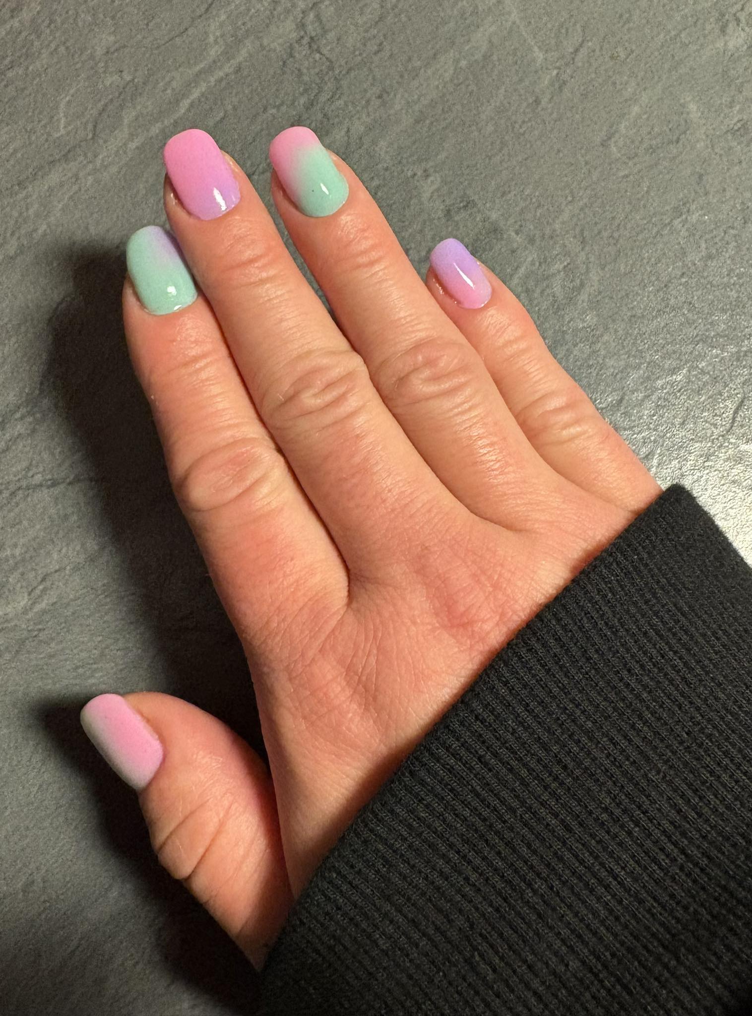 Mitt första försök till ombre. Det var lite knepigt och tidskrävande med två penslar, särskilt på högerhanden, men det blev fint till slut. Pillow talk och Flower child🤍💗