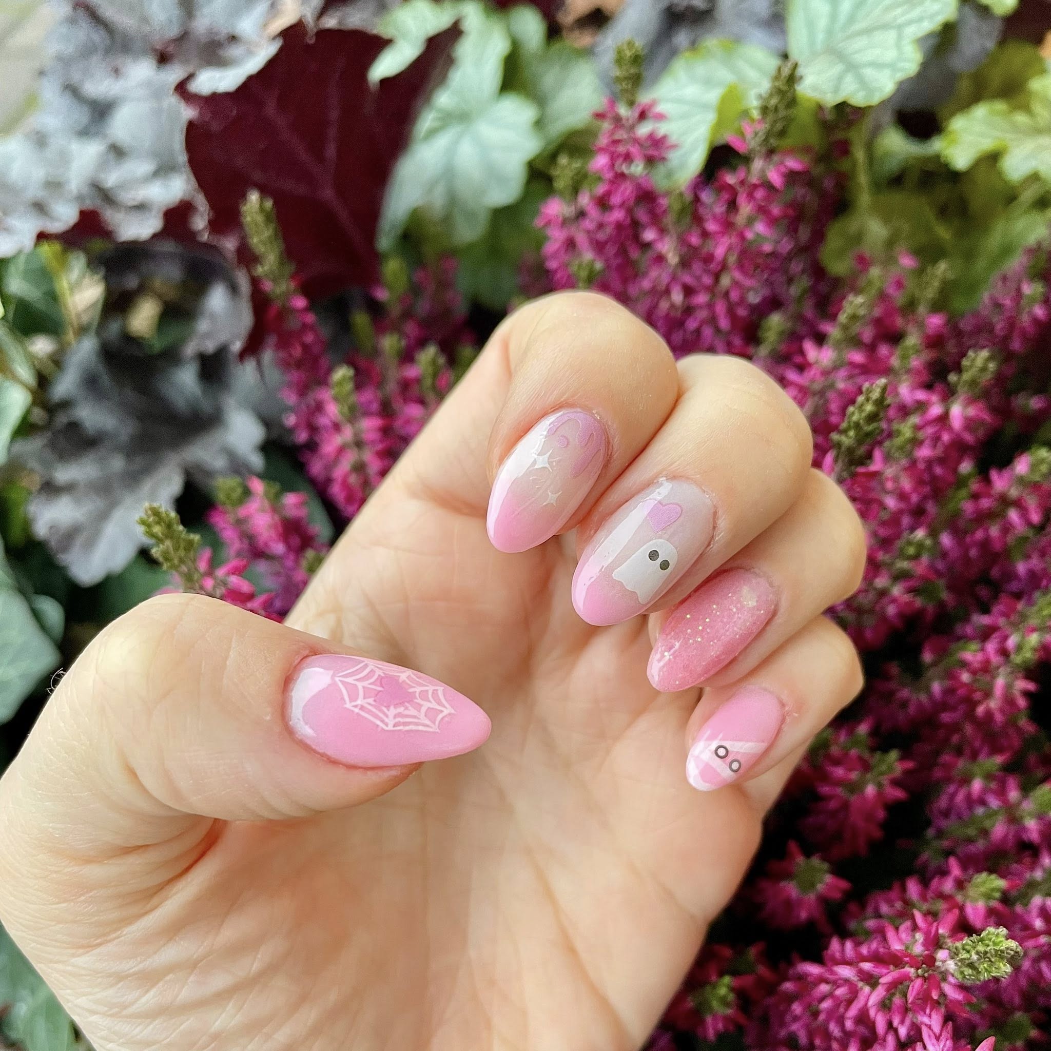 Cute & pink Halloween 💖👻 🎨 Daydream, Bare neccesity 💅 Naturliga naglar, glitter & dekaler ej från dippi. Vänster långfinger limmad med te-påse och build i grunden pga halvt bruten tipp. Helt osynligt!
