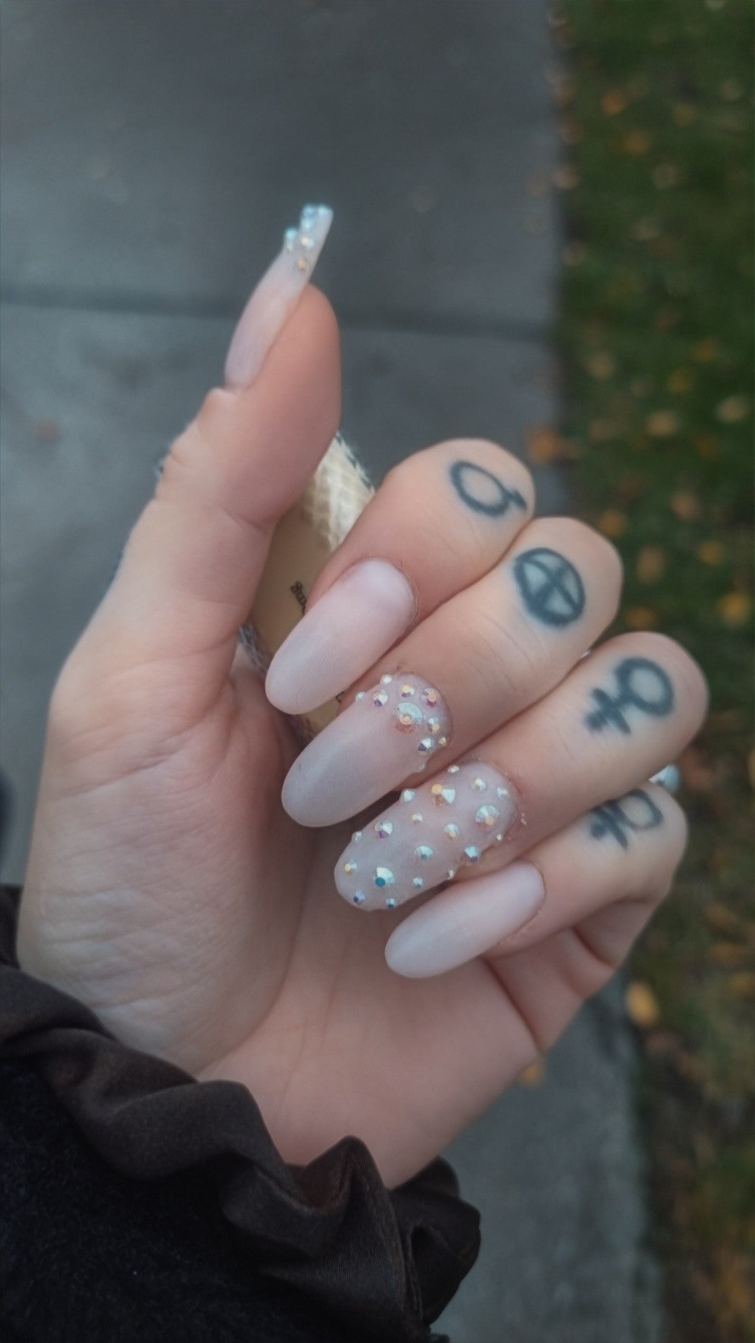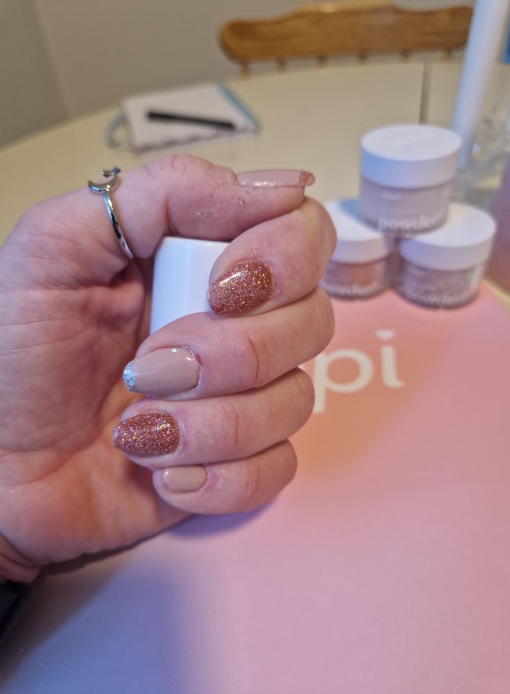 Min absolut finaste manikyr hittills 🥰 Saknat en nude-rosa så blandade min egen med persuasion och clear (och väldigt lite pillow talk). dippi Även använt färgen envy plus lite glitter jag hade hemma.