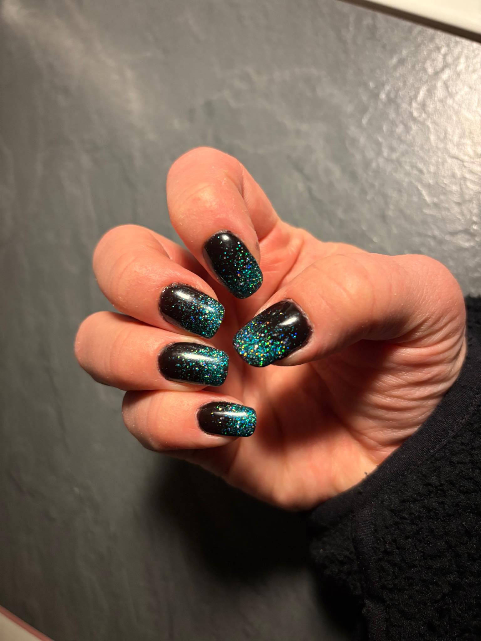 Blackout + kinetic (bilden gör inte kinetic rättvis, det är en helt makalöst härlig färg 🤩) Älskar kombon svart botten + färgat glitter! 🙌🏻 Får se vad nästa omgång bjuder på! (Blir säkerligen inom en vecka då jag tycker det är sååå roligt att testa nya färger o kombinationer 😄)