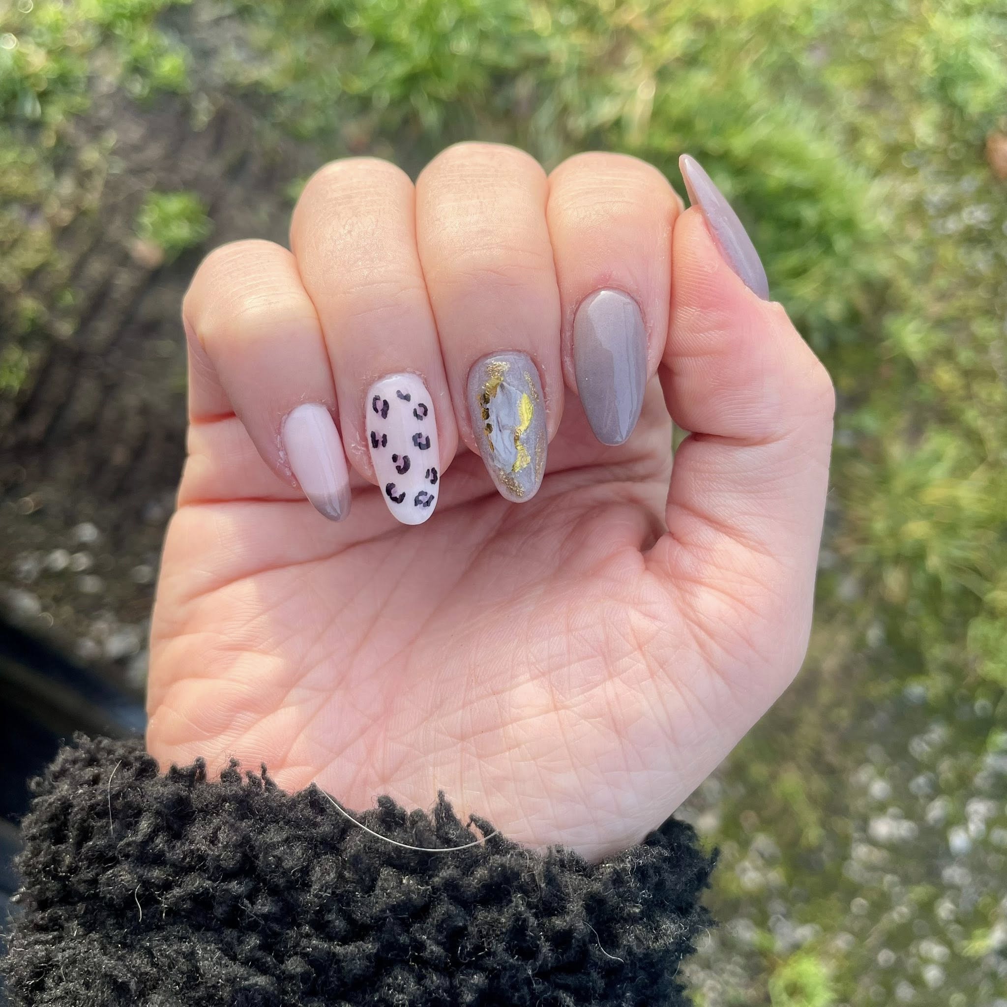 Novembernaglar 🩶 🎨 Imagine That, Bare Neccesity & Pillow Talk 💅 Naturliga naglar. Dekaler på långfingrar, vanligt guldnagellack & mönster ritade med akrylpenna - ej från dippi. Vänster långfinger fortfarande limmad med te-påse och build i grunden pga halvt bruten tipp. Helt osynligt!