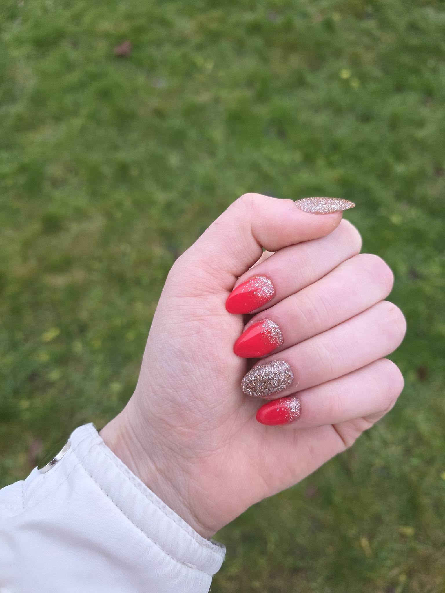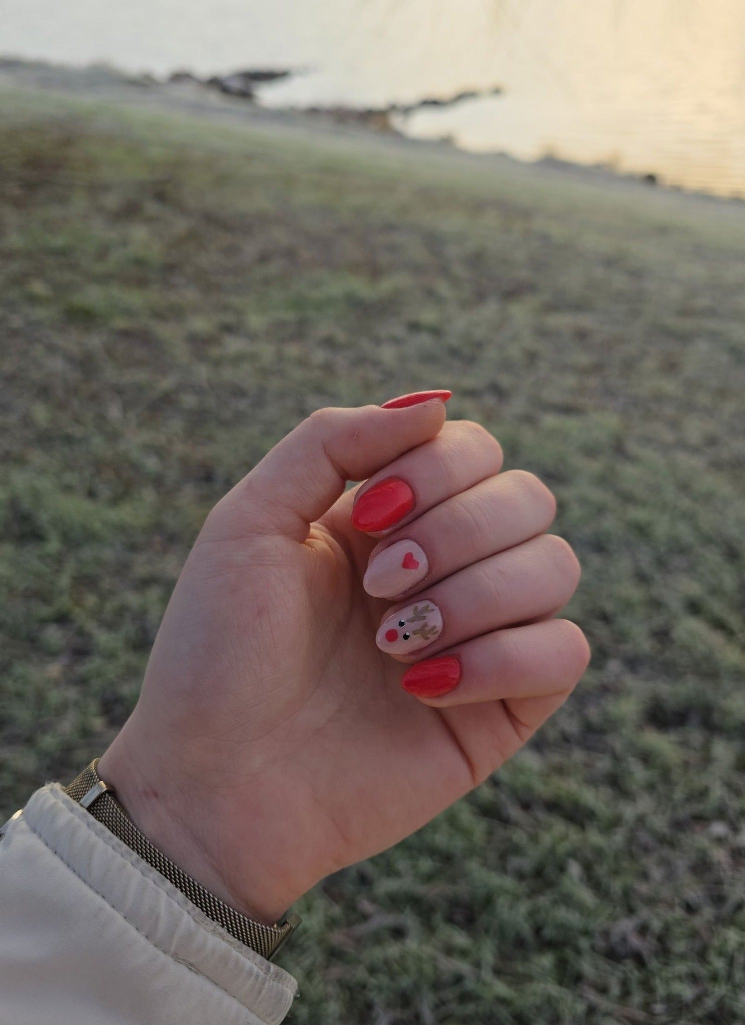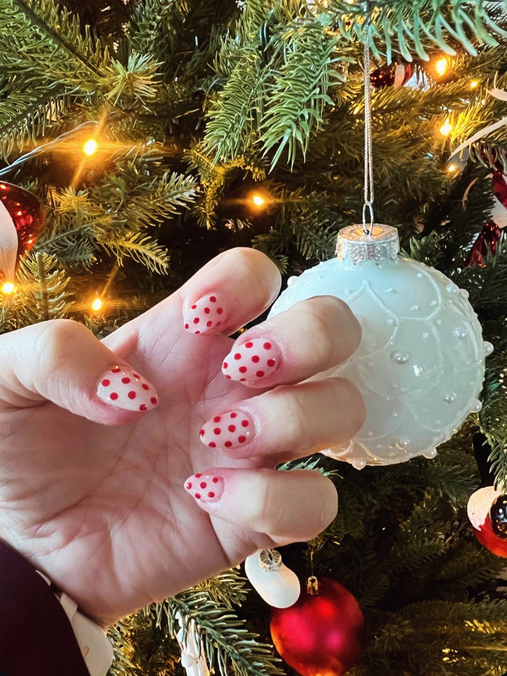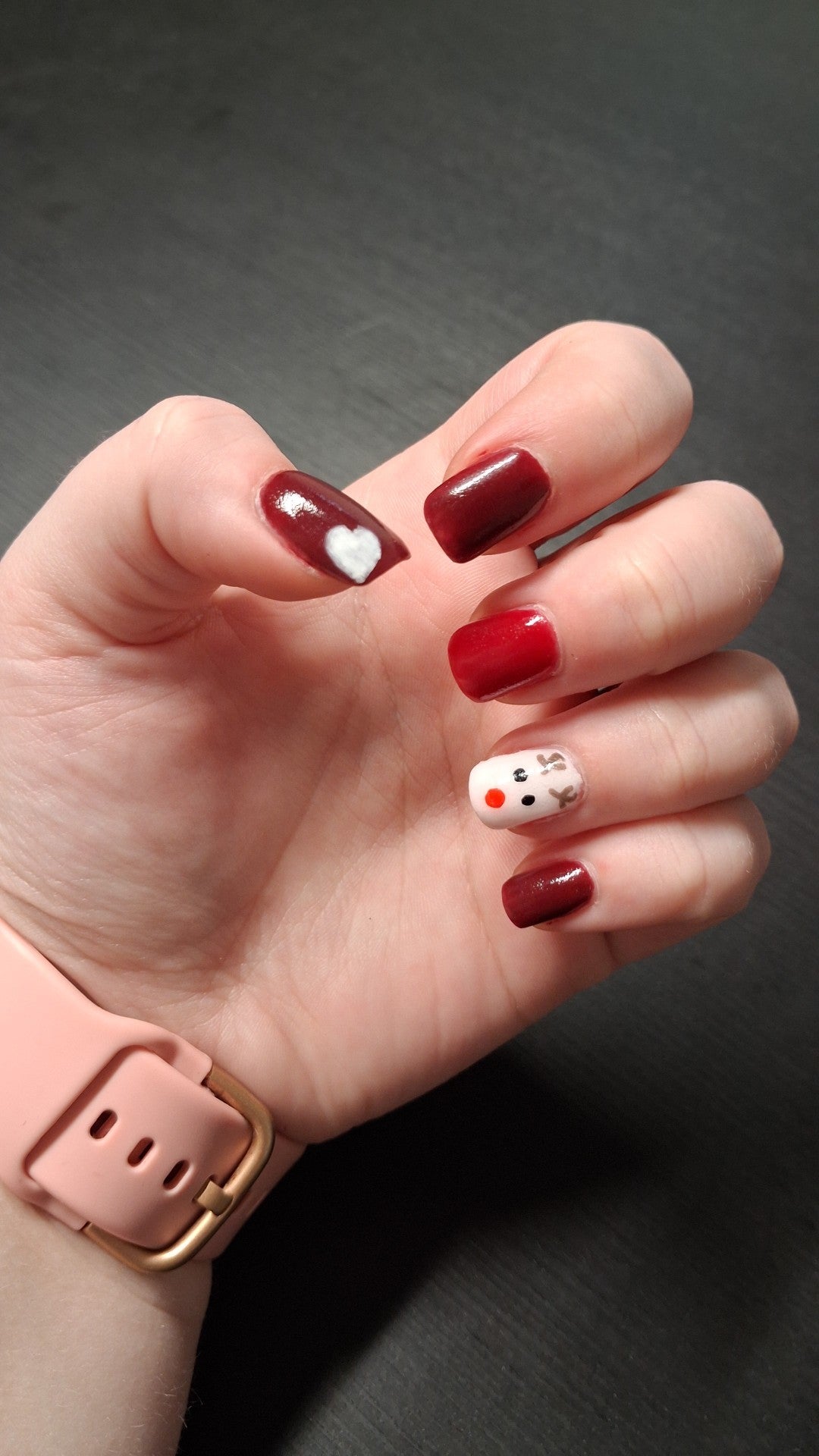 Nu har jag gjort mina julnaglar! Ville gärna använda mina pennor, men blev nöjd med resultatet och visste inte vad jag skulle dekorera med, så jag lät det vara… men funderar på om jag ska lägga till en vit linje längs med den inre bågen på tipparna…? Åsikter? Förslag?