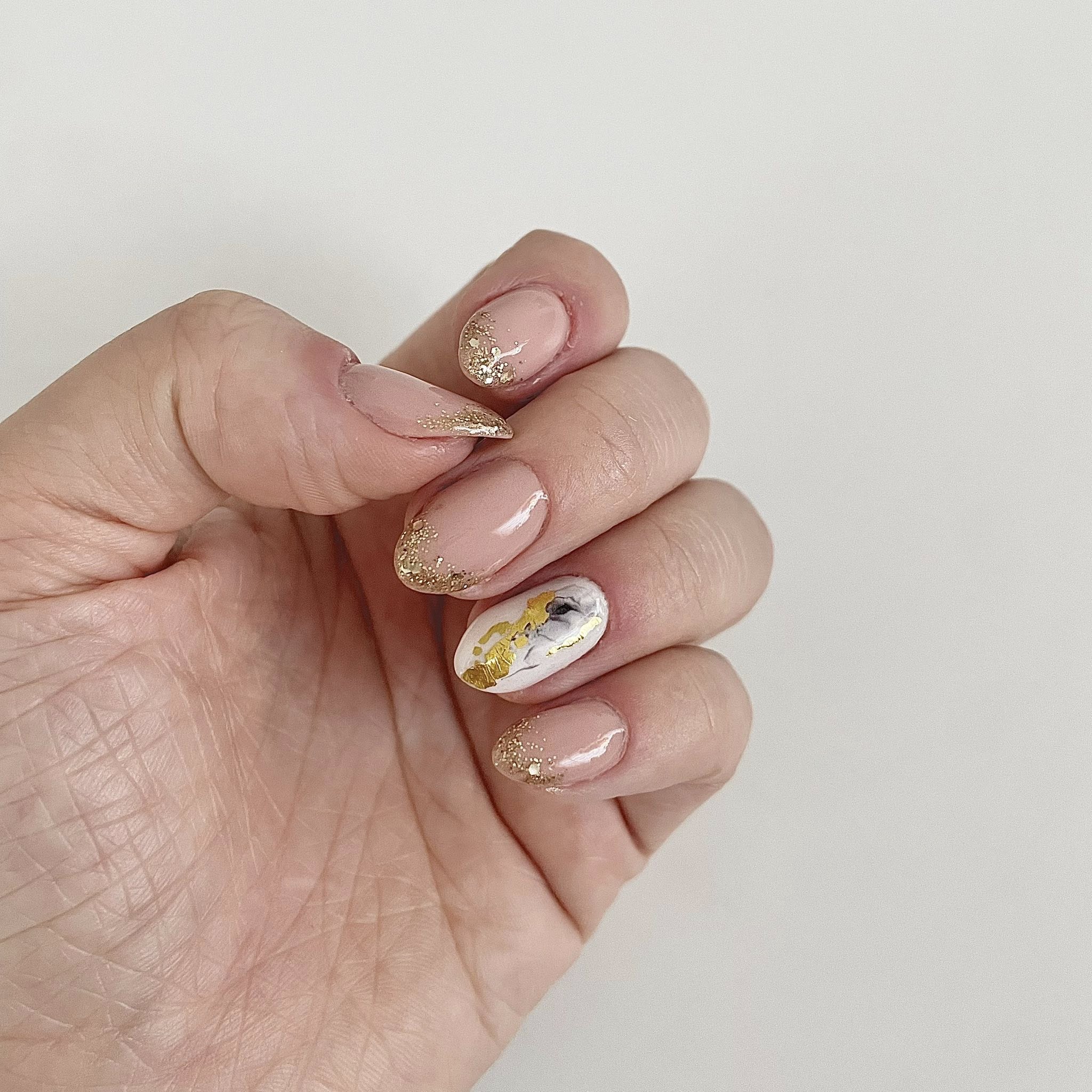 Novembernaglar 🩶 🎨 Imagine That, Bare Neccesity & Pillow Talk 💅 Naturliga naglar. Dekaler på långfingrar, vanligt guldnagellack & mönster ritade med akrylpenna - ej från dippi. Vänster långfinger fortfarande limmad med te-påse och build i grunden pga halvt bruten tipp. Helt osynligt!